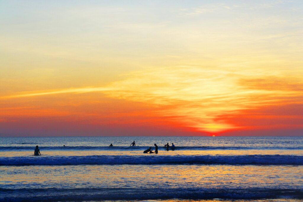 Kuta ist für viele der erste Kontakt mit Bali. Breiter, dunkler Sand, Surfschulen an jeder Ecke und Sonnenuntergänge, die trotz des Chaos unvergesslich sind. Für Surf-Anfänger ist Kuta ideal, und wer Partys und Trubel sucht, wird hier glücklich.